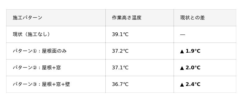 この工場の場合、屋根面だけでも約‒ 2℃の低下が見込める一方で、窓を加えても効果の上乗せは小さいことがわかります。つまり、「屋根だけで十分なのか、壁までやるべきなのか」を数値で判断できるため、不要な過剰投資を避けられます。