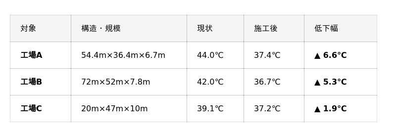 ※本事例の工場はスレート屋根に金属カバーを重ねた構造のため、遮熱シートの効果が比較的小さく出ています。折板屋根や金属屋根のみの工場では、より大きな温度低下効果が見込まれます。