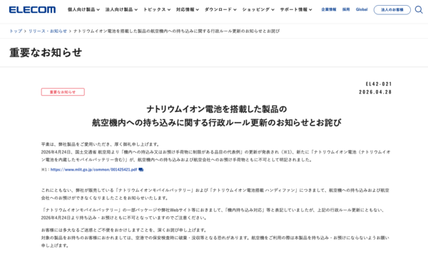 エレコムは、4月24日に国土交通省 航空局が発表した「機内への持込み又はお預け手荷物に制限がある品目の代表例」の更新を受け、自社製品である「ナトリウムイオン電池モバイルバッテリー」および「ナトリウムイオン電池搭載 ハンディファン」の航空機内持ち込みと航空会社へのお預けが不可となることをお知らせする。
