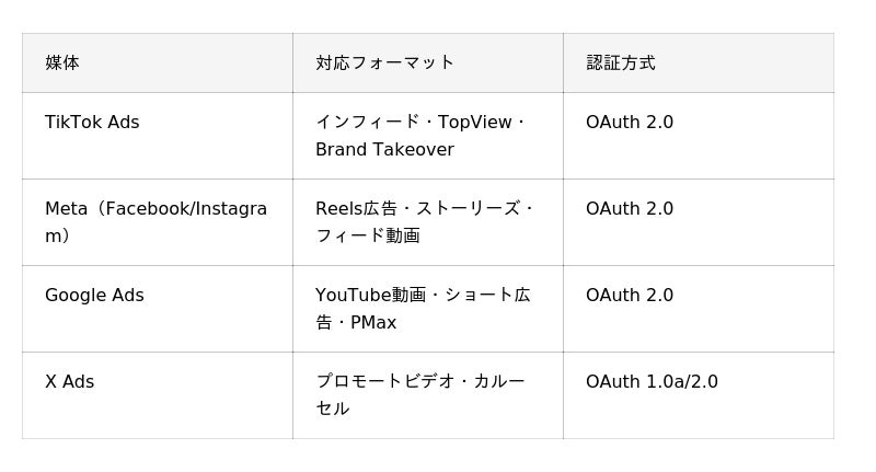 TikTok/Meta/Google/X Adsとの直接API接続。クリエイティブ入稿・キャンペーン管理・レポート取得を一元化