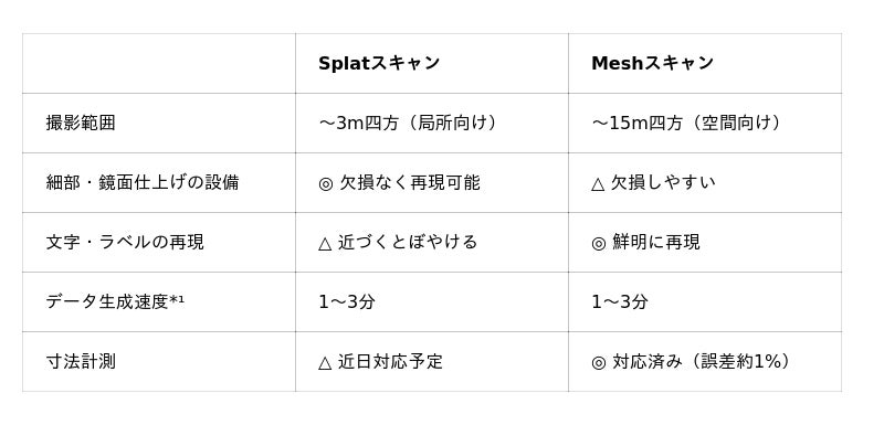 上表を踏まえると、現場空間全体はMeshスキャン、細部の機器・設備はSplatスキャンと使い分けることで、現場を丸ごとカバーできます。