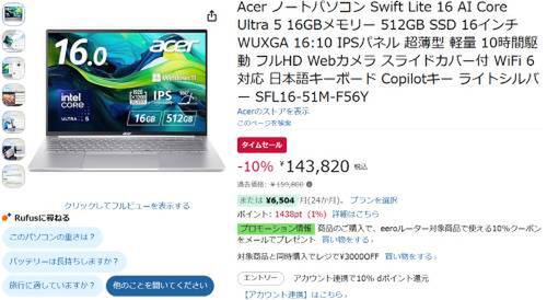 16インチなのに約1.16kg。Core Ultra 5×16GBのAcer「Swift Lite 16」が割引中