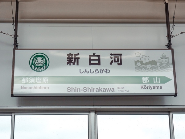 大宮から東北新幹線に乗って約1時間で新白河に到着。だるまと桜咲く小峰城のイラストが描かれた駅名標にほっこり。