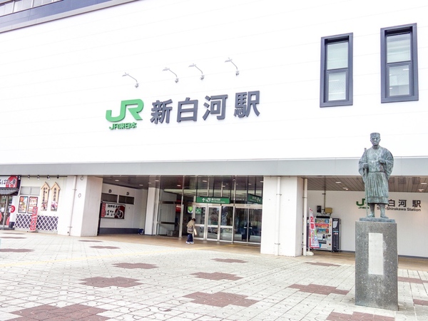 駅前には“東北の玄関口”白河関を越えた松尾芭蕉の銅像が佇みます。