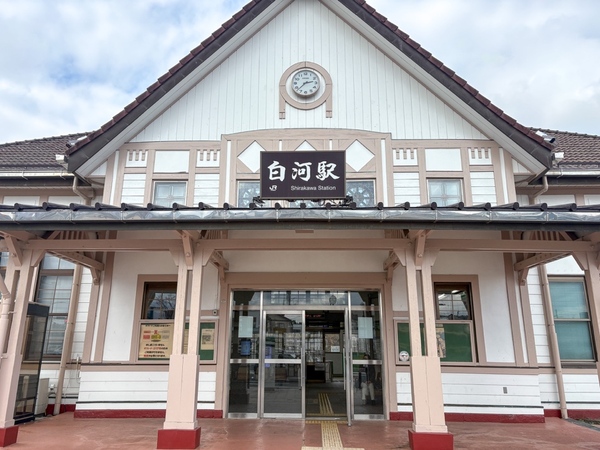 白河駅の前を通って写真を撮りました。「ステンドグラスのある赤瓦の屋根の大正ロマン漂う駅舎」として、東北の駅百選に選定されたと聞いたとおり、すごく素敵な駅舎です。2020年に放送された、ダイハツ・ムーヴキャンバスのテレビCMのロケ地としても有名だそうです。YouTubeで見てみたら、かわいい駅にかわいい車で娘を迎えにくる日常を切り取った素敵なCMでした。