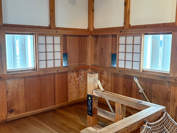小峰城の天守かと思ったのは、三層三階の櫓(やぐら)でした。再建された三重櫓の内部は靴を脱いで無料で見学できます。狭くて急な階段を2回上ると、三重櫓の最上階に到着。