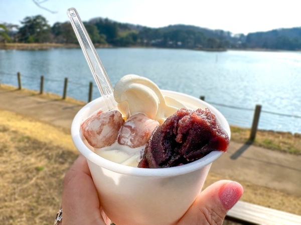 ソフトクリームに南湖だんごとあんこがトッピングされていて、これは合わないわけがない。絶対食べることをおすすめします。