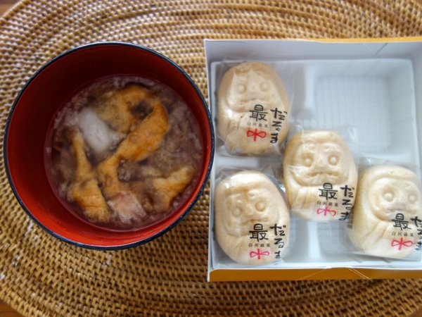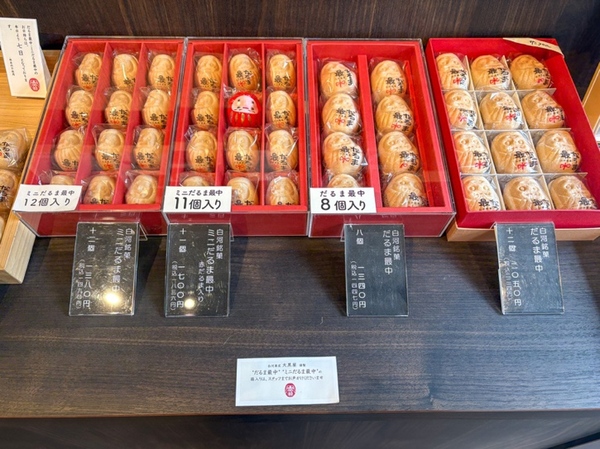 地元の方がよくお土産に使うのは、こちらの「だるま最中」。お椀に入れてお湯を注げばお汁粉にもなるとのこと。一口サイズのミニだるま最中もかわいらしいけど、お汁粉にするなら普通のサイズがいいかな。
