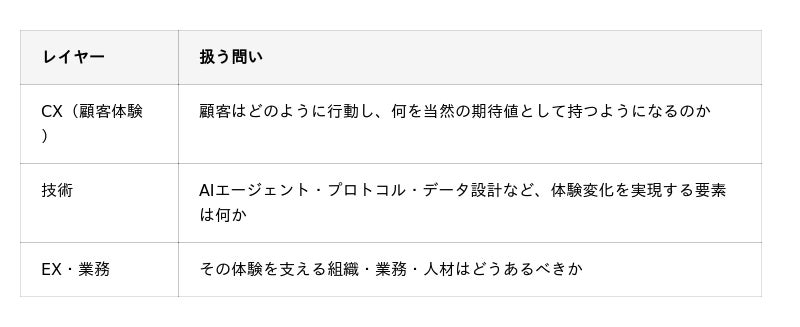 本委員会では、顧客体験を以下の三層で整理し、共通言語として議論を進めます。