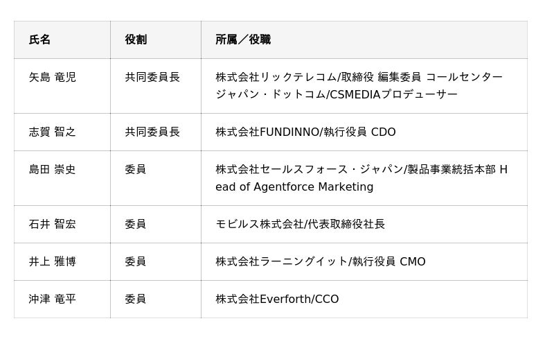 本委員会は、事例共有や情報交換の場にとどまらず、AIエージェント時代における顧客接点のあり方を再定義し、共通の設計思想・実務フレーム・実装指針を共同で構築することを目的としています。