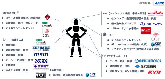 現在、以下の企業・機関がメンバーとして参画しており、今回新たに株式会社アイシンが参画、株式会社アークが特別協賛として参画いたします。産業界・学術界を横断する“ヒューマノイドのための日本連合”として、今後も広く参画を募ってまいります。
