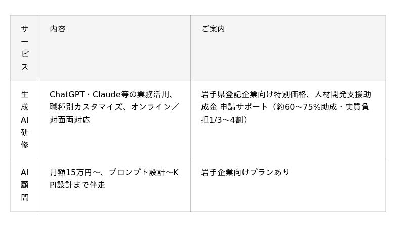あわせて、岩手県登記企業を対象とした生成AI研修・AI顧問サービスを、人材開発支援助成金の活用サポート付きで提供開始します。