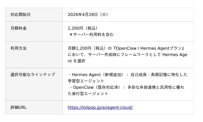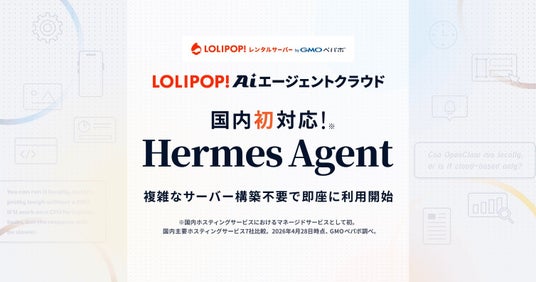 GMOインターネットグループのGMOペパボ株式会社(代表取締役社長:佐藤 健太郎 以下、GMOペパボ)が運営する「ロリポップ!レンタルサーバー byGMOペパボ」(URL:https://lolipop.jp/)は、AIエージェントを専門知識なしでクラウド上に構築できる機能『ロリポップ!AIエージェントクラウド byGMOペパボ』(URL:https://lolipop.jp/ai/agent-cloud/)において、2026年4月28日(火)より、新たにAIエージェントフレームワーク(※1) Hermes Agent(※2)に対応しました。