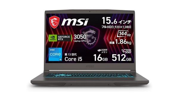 Thin-15-B13UC-6102JPは、インテル「Core i5-13420H」とNVIDIA「GeForce RTX 3050」を搭載する15.6型ゲーミングノートPC。メモリーは16GB(DDR4)、ストレージは512GB SSD、解像度はフルHD(1920×1080ドット)、リフレッシュレートは144Hz、OSはWindows 11 Homeなど。