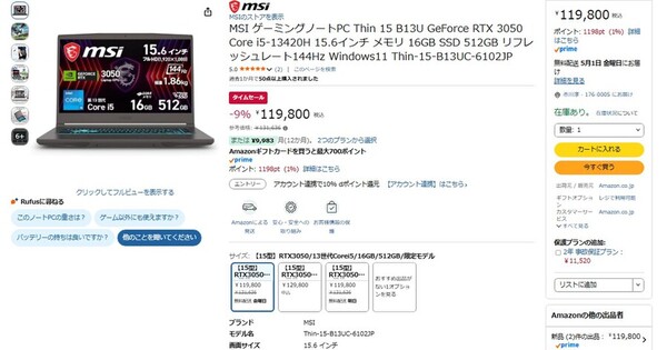 Amazon.co.jpにて、MSIの15.6型ゲーミングノートPC「Thin-15-B13UC-6102JP」が販売中だ。参考価格は13万1636円だが、タイムセールにより9%オフの11万9800円で購入できる。