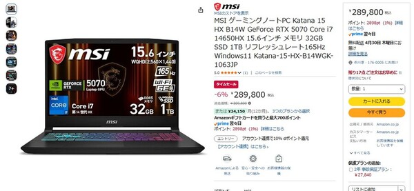Amazon.co.jpにて、MSIの15.6型ゲーミングノートPC「Katana 15 HX B14W」が販売中だ。過去価格は30万9800円だが、タイムセールにより6%オフの28万9800円で購入できる(4月28日時点)。