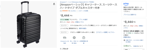 Amazonベーシックの「スーツケース ハードタイプ ダブルキャスター付き」が8,444円で販売中。4月29日18時の情報だが、本日注文で最短5月1日(金)に届くよう!