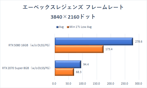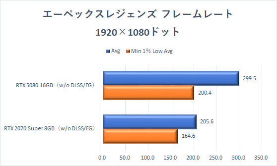 軽量な「エーペックスレジェンズ」は、約7年前に登場したGeForce RTX 2070 Superでも、高リフレッシュレートゲーミングディスプレーと組み合わせてプレイを楽しめるわけだが、GeForce RTX 5080ならフレームレートは上限の300fpsに達する。FPSゲームおなじみのフレームレート重視の画質設定にすることで、リフレッシュレート240Hzの張り付きプレイも十分実現できる。
