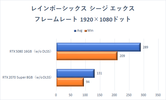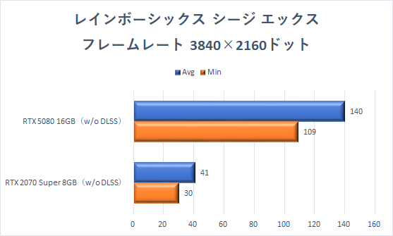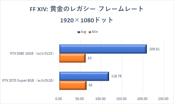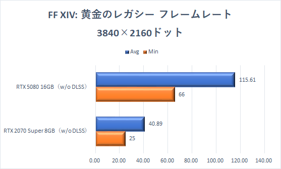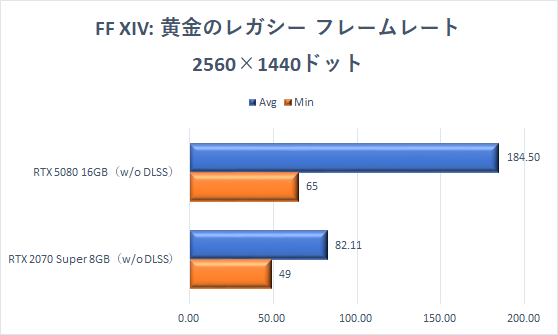 ここまでと同じく、GeForce RTX 2070 SuperでもフルHD解像度なら快適に楽しめるが、GeForce RTX 5080に交換することで、平均フレームレート(Avg)はいずれの解像度でも2倍近くに向上している。ファイナルファンタジーXIVの世界を美麗な高解像度で楽しめる。