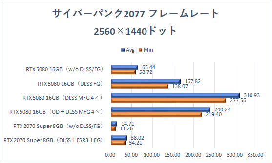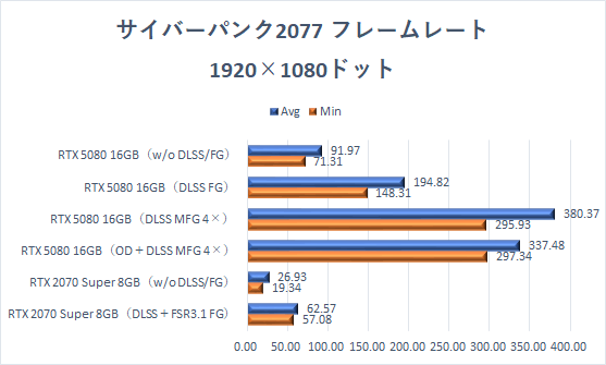 GeForce RTX 2000シリーズは、NVIDIA DLSSこそ使用できるが、フレーム生成はGPUを選ばずに使える「AMD FSR 3.1 Frame Generation(FSR3.1 FG)」となる。GeForce RTX 2070 Superは、NVIDIA DLSSとFSR3.1 FGを使わない状態(w/o DLSS/FG)と、活用した状態(DLSS+FSR3.1 FG)の2つパターンで計測している。