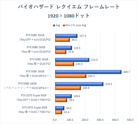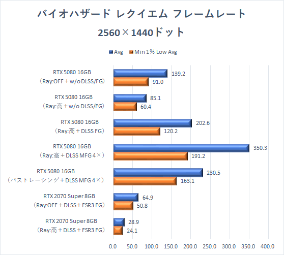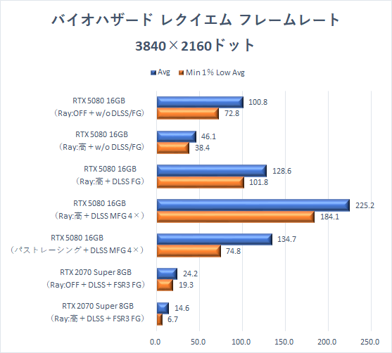 最後は最新ゲームタイトルの「バイオハザード レクイエム」で確認していこう。画質設定は「最高」をベースに、レイトレーシング「オフ」と「高」を選んだ。フレームレートは、「CapFrameX」を使って雨の中を歩いて行く冒頭シーンで計測した。ここまでの傾向からGeForce RTX 2070 Superは、NVIDIA DLSS”クオリティ”+FSR3.1 FGを効かせた状態としている。