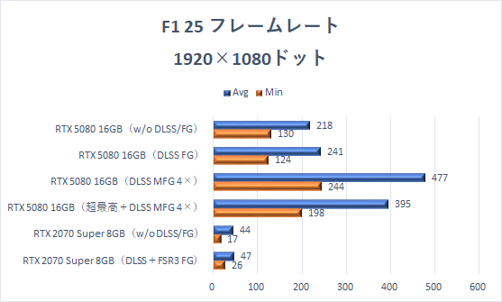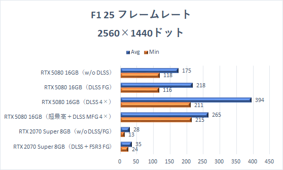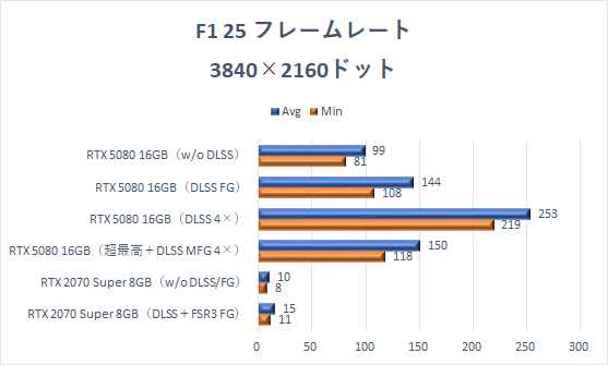 続いてはレーシングゲームの定番となる「F1 25」で確認していこう。画質設定はレイトレーシングを効かせる「超高」プリセットをベースに、内蔵ベンチマーク(ラスベガス、ウェット)で計測した。