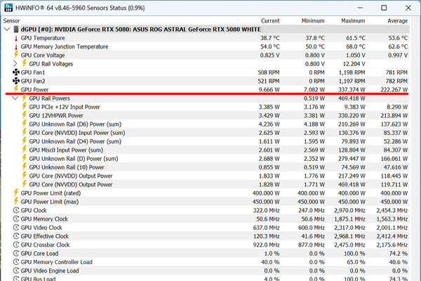 GeForce RTX 5080を搭載するASUS「ROG-ASTRAL-RTX5080-O16G-WHITE」は、最大650Wを供給する16ピン 12V-2x6(12VHPWR)コネクターが採用されている。ゲームプレイ中のビデオカード消費電力も、GeForce RTX 2070 Superの約1.5倍となる約340Wと大幅に増加している。