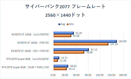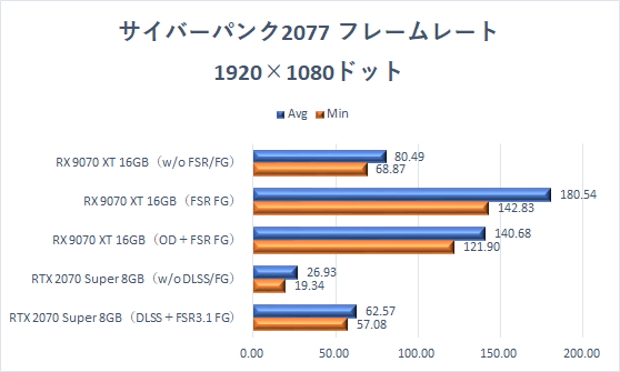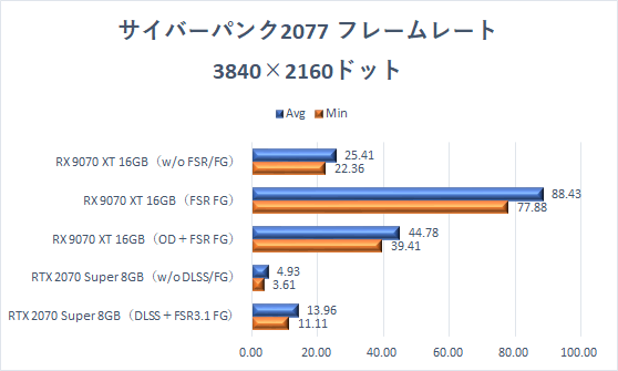 GeForce RTX 2070 Superではゲームプレイのボーダーラインとなる60fpsを下回ってしまうが、Radeon RX 9070 XTなら4K解像度でも楽しめる。さらにWQHD解像度ならパストレーシングを効かせた最高画質でのプレイも狙えるフレームレートを記録している。