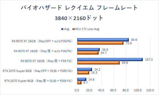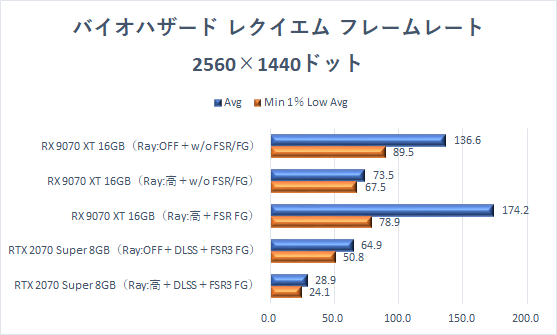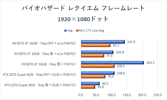 最後のゲームタイトルは「バイオハザード レクイエム」だ。「サイバーパンク2077」と「F1 25」と違って、現在のゲームバージョンでは、Radeonはパストレーシングを選べない。そのため、レイトレーシング「高」設定までのフレームレートをチェックした。