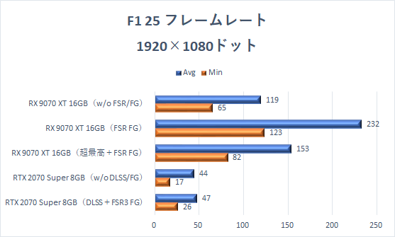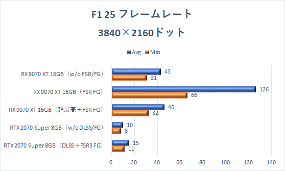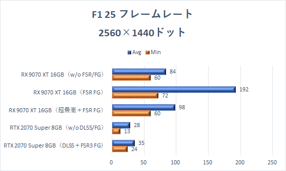続いて「F1 25」を確認すると、アップスケーリングとフレーム生成を活用することで、レイトレーシングを効かせた「超高」での4Kゲーミングが狙えるパフォーマンスを発揮している。フルHDとWQHD解像度なら、パストレーシングを効かせた「超最高」設定でのプレイを狙える点も注目だ。