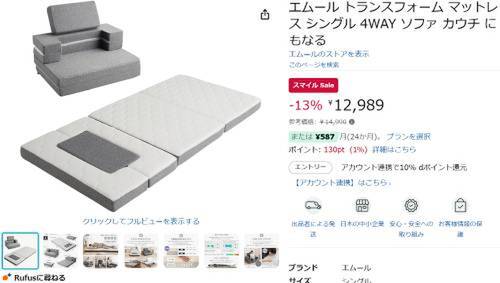 エムールのマットレス「トランスフォーム マットレス シングル 4WAY」がAmazonスマイルセール対象。参考価格14,990円のところ、13%オフの12,989円で販売中。
