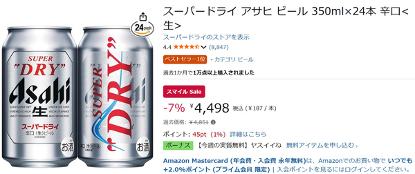現在開催中のAmazonスマイルセールで、「スーパードライ アサヒ ビール 350ml×24本 辛口<生>」が1本あたり約187円という割引価格で販売されています。
