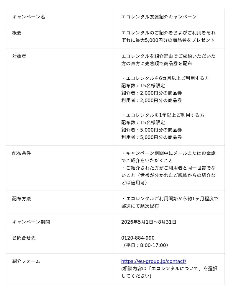 広島、岡山、愛媛、香川県エリアで給湯器事業を展開するEUグループ株式会社(本社:岡山県倉敷市、代表:河合 雄治)は、2026年5月1日より、創業2周年を記念して給湯器サブスクレンタル「エコレンタル」のご紹介、ご成約で最大5,000円分の商品券が「相互」にもらえる友達紹介キャンペーンを実施いたします。