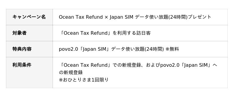 ~povo2.0と「Ocean Tax Refund」が連携し、免税手続きの前後で使える「Japan SIM」の「データ使い放題(24時間)」のコードがもらえるキャンペーンを実施~
