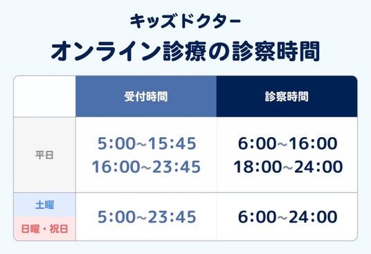 連休中は休診となる対面クリニックが多く、急な体調不良の際の受診先に困る方も多くいらっしゃるかと思います。キッズドクターは毎日休まず診察しますので、お困りの際はお気軽にご相談ください。