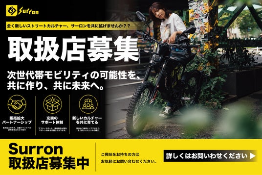 Surronでは、日本国内におけるブランド展開のさらなる拡大に向け、販売店・取扱パートナーの募集を行っております。