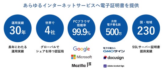 日本発の最上位認証局「GlobalSign」を運営し、世界11か国の拠点から各国の政府機関や企業に電子認証や電子署名の技術を提供しています。さらに、これらの技術を活用した国内シェアNo.1(※5)電子契約サービス、電子印鑑「GMOサイン」を企業や自治体に提供し、安全な社会インフラを支えています。