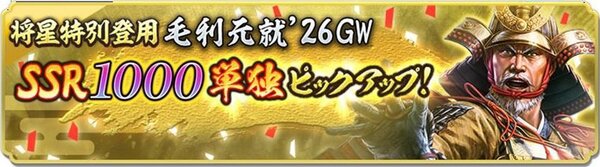 「将星特別登用・毛利元就 '26GW」を開催中。初期威名1000で複数勢力(毛利家/大内家)所属となるSSR【神機妙算】毛利元就が単独ピックアップされる。