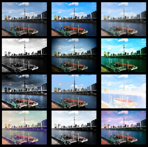 主なアートフィルターの作例。ノーマル、ポップアートⅠ、ファンタジックフォーカス、ラフモノクロームⅠ、トイフォトⅠ、クロスプロセスⅠ、ドラマチックトーンⅠ、リーニュクレールⅠ、ウォーターカラーⅠ、ヴィンテージⅠ、ブリーチバイパスⅠ、ネオノスタルジー。