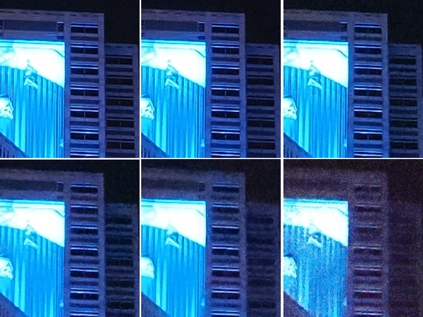 感度別に撮影した写真の一部を拡大して比較。左上からISO3200・ISO6400・ISO12800・ISO25600・ISO51200・ISO102400。使用レンズ「12-45mm F4」・絞りF6.3・ノイズ処理標準。