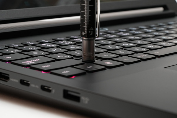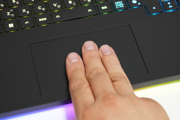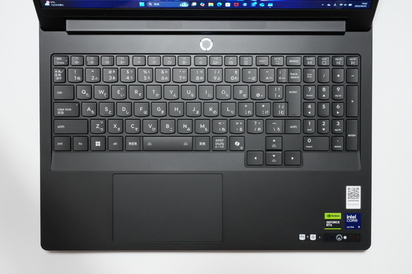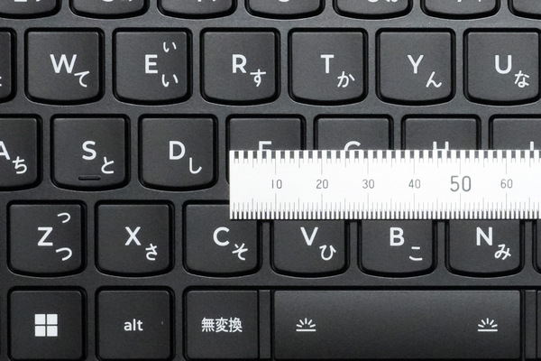 「ThinkPad」と同じ形状のキーの打鍵感は良好。ただし横幅364.38mmのボディーに、実測19.2mmのキーピッチで文字キーを配置し、テンキーも搭載しているので、テンキーの幅がかなり狭い。本製品のテンキーは、数字入力というよりも、ゲーム用に搭載されていると考えたほうがよさそうだ。