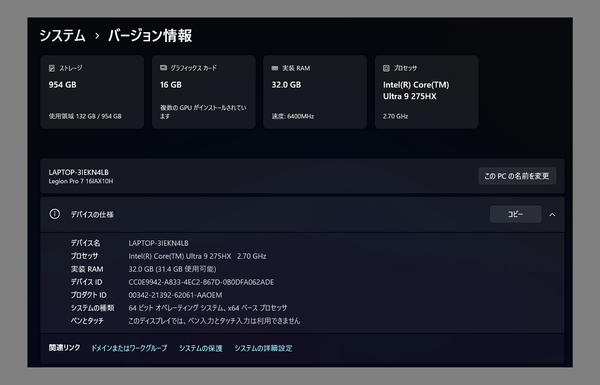 最後にパフォーマンスをチェックしよう。今回の「Lenovo Legion Pro 7i Gen 10」は、Core Ultra 9 275HX/ GeForce RTX5080/ 32GB(DDR5-6400)/ 1TB(PCIe Gen4 x4接続SSD)というスペックのモデルだ。