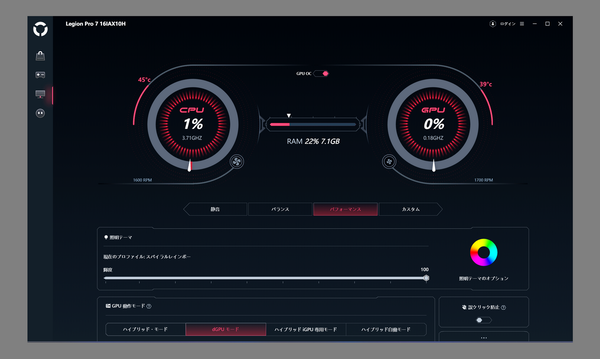本製品の売りのひとつが「Lenovo AI Engine+」だ。これはAIを活用したパフォーマンス最適化技術で、マザーボード上に搭載されている独自チップ「Lenovo AI Core」により、パフォーマンスモードとバランスモードにおいて、プロセッサーとディスクリートGPUのワット数を動的に調整してくれる。本機能によりパフォーマンスを最大化し、スムーズなフレームレートを実現すると謳われている。