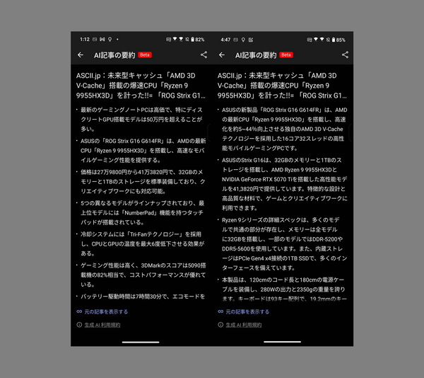 まずは「AI記事の要約」。これはMeta社のAIモデル「Llama 3 8B」が採用された要約機能で、どんなに長い記事でも「共有→AI記事の要約」を選択することで、数秒単位で記事の要約を作成してくれる便利機能だ。