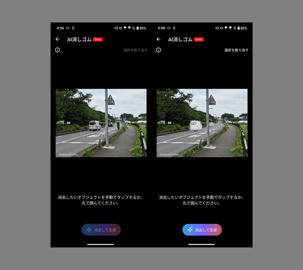 「AI消しゴム」はAIを活用したおなじみの画像編集機能。写真をタッチ、または囲むだけで、不要なオブジェクトを消去し、削除した部分を生成AIにより補完してくれる。ただ今回試したかぎりでは、やや不自然な画像となってしまっている。現時点ではまだベータ版なので、より自然な仕上がりに改善されることを期待したい。