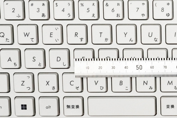 付属するワイヤレスキーボードは日本語配列でキーピッチは実測19mm前後、キーストロークは実測2.2mm前後だ。