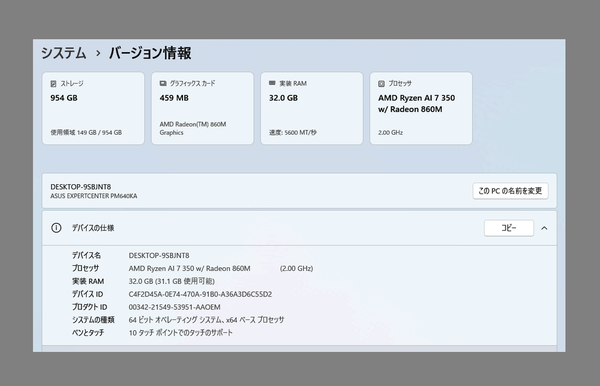 メモリーは32GB(DDR5、最大 64GB)、ストレージは1TB(PCIe Gen4 x4接続SSD)を搭載している。AMD Ryzen AI 7 350は最大50TOPSのNPUを内蔵しているので、本製品はCopilot+ PCの要件を満たしているというわけだ。