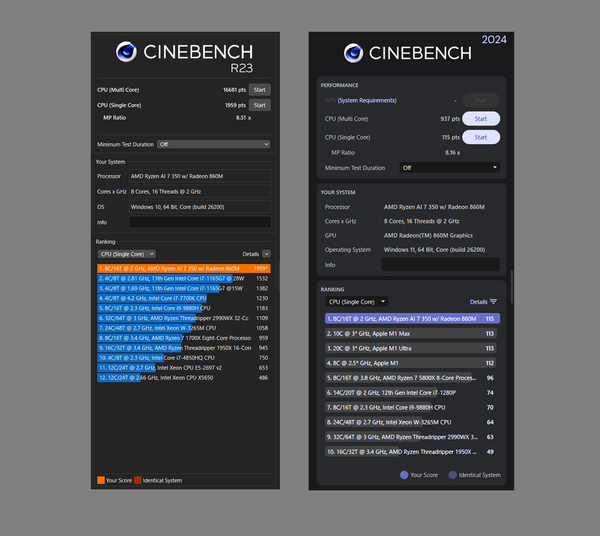 「CINEBENCH R23」のCPU(Multi Core)は16681pts、CPU(Single Core)は1959pts、「CINEBENCH 2024」のCPU(Multi Core)は937pts、CPU(Single Core)は115pts