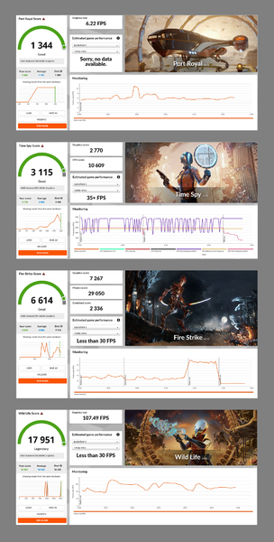 3Dグラフィックス性能については、「3DMark」のPort Royalは1344、Time Spyは3115、Fire Strikeは6614、Wild Lifeは17951だった。