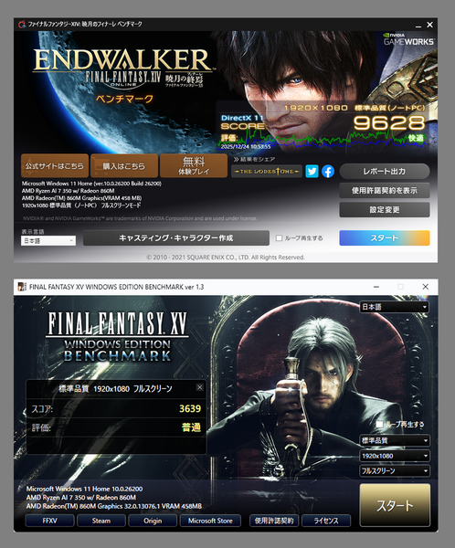 「ファイナルファンタジーXIV:暁月のフィナーレベンチマーク」(1920×1080ドット、標準品質、ノートPC)のスコアは9628(快適)、フレームレートは平均67.19fps/最低30fps、「FINAL FANTASY XV WINDOWS EDITION BENCHMARK ver 1.3」(標準品質、1920×1080ドット、フルスクリーン)のスコアは3639(普通)